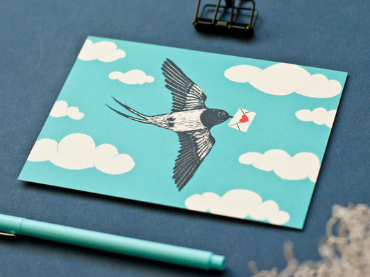 Postkarte A6 Schwalbe mit Liebesbrief
